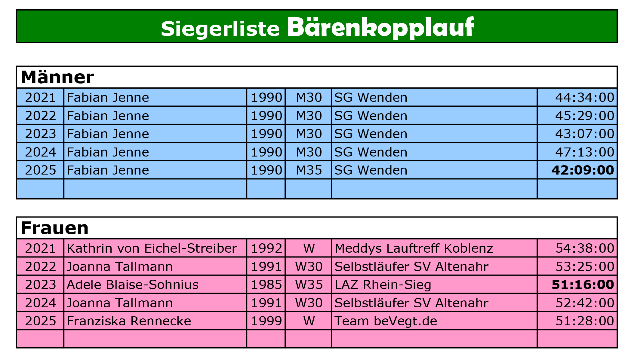 Fabian Jenne (SG Wenden) trug sich beim Bärenkopplauf zum fünften Mal in die Siegerliste ein und verbesserte seinen eigenen Streckenrekord mit 42:09 Min um fast 1 Minute.