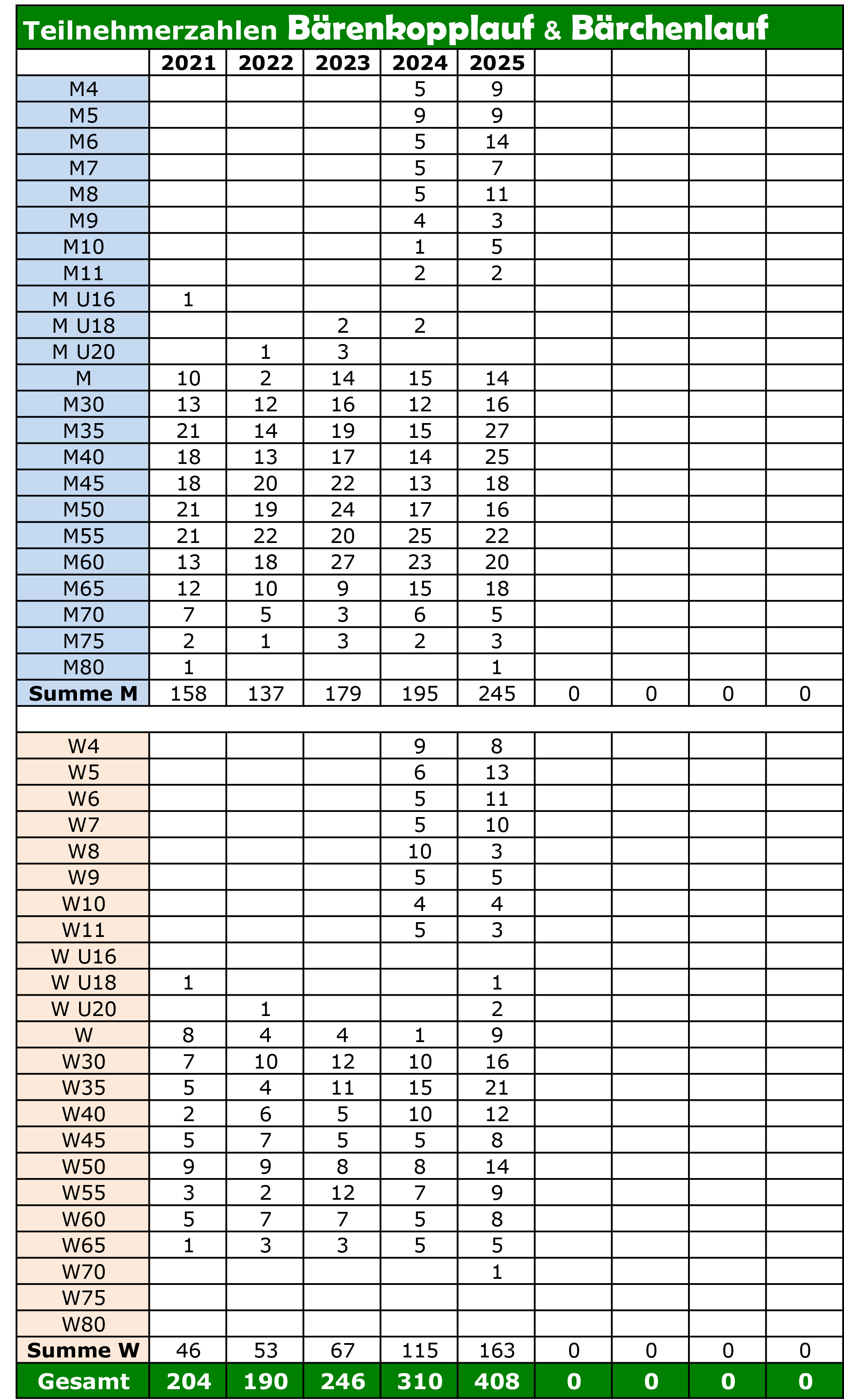 Mit 117 Finishern bei den Bärchenläufen und 291 Finishern beim Bärenkopplauf gab es mit insgesamt 408 einen Teilnehmerrekord.